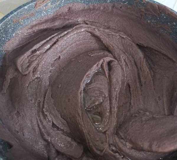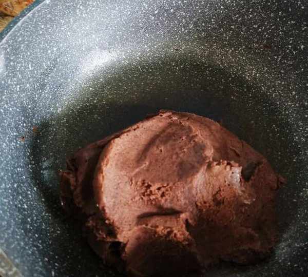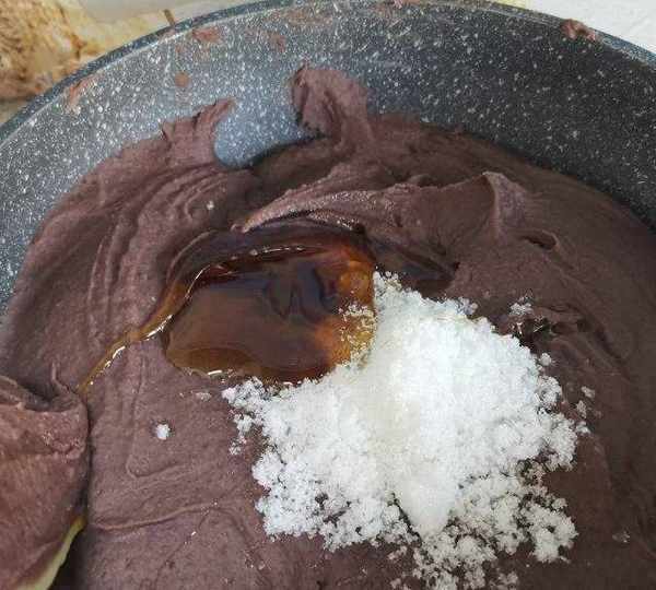 第5步、不粘鍋中倒入70克玉米油,加入豆泥中小火開始煸炒。