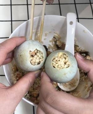 把蛋的蛋清蛋黃分開後 把糯米灌進去 灌進去的同時一定不能太暴力 也不要把糯米塞太滿瞭 不然蒸的時候