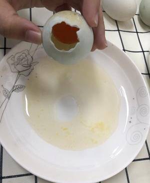 生咸鴨蛋洗幹凈 切記一定要清洗幹凈然後輕輕在小的那頭敲一下.慢慢的把蛋殼剝開 要記住頭不要開太大再把鴨蛋的蛋清倒出碗裡 蛋黃要留在但裡面