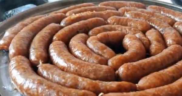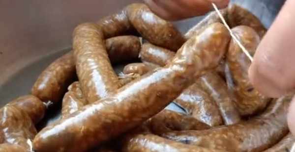5、線綁好之後,用牙簽在香腸上戳幾個洞,放入蒸鍋中,開小火蒸一個小時左右。要用小火蒸,用大火蒸的話容易爆裂。