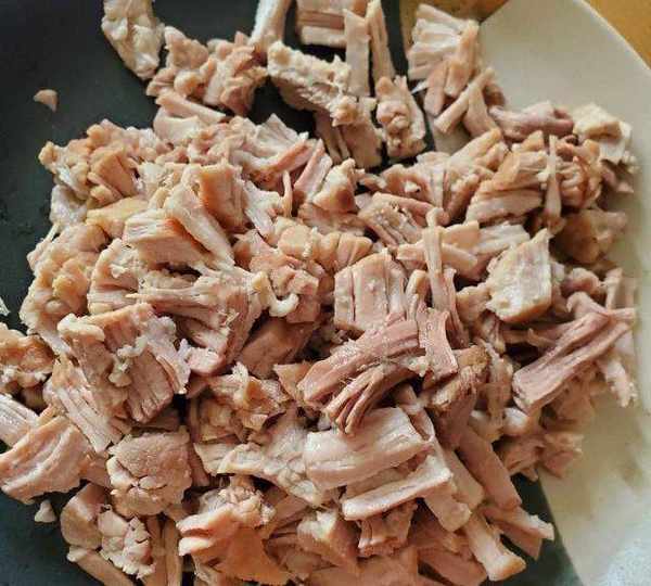 第8步、瘦肉晾涼後用手捏碎撕碎。