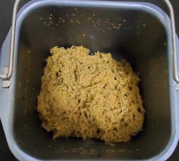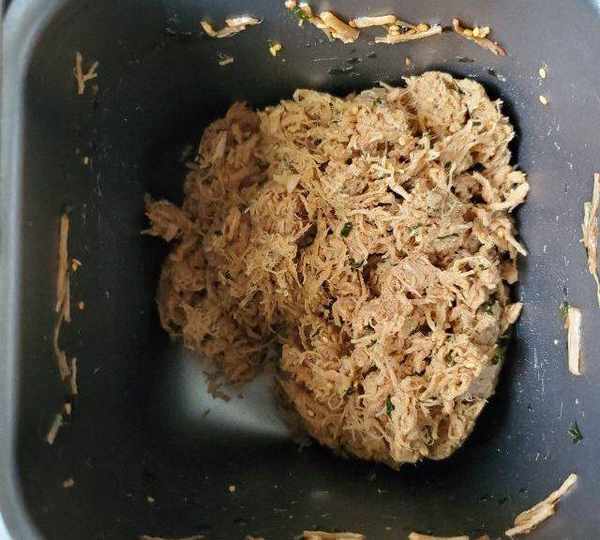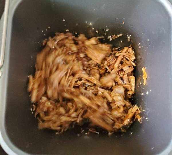 第10步、將瘦肉碎放入面包桶裡,倒入醬汁拌勻,啟動和面程序20。