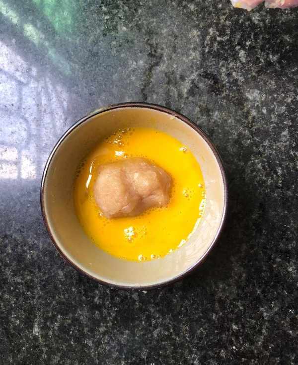 步驟三:攪拌好的土豆和雞胸肉先抓出個大丸子的形狀來,然後一起放到雞蛋液中裹上一層蛋液,蘸上面包糠,隨後一起放到烤盤上,烤盤上要事先墊上一層油紙,這樣能夠更好的防止食材粘連。