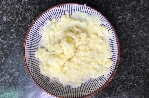 步驟二:土豆去皮之後清洗幹凈,然後上鍋蒸,蒸熟之後搗爛成泥,放黑胡椒粉、鹽一起攪拌均勻,再和攪拌好的雞胸肉泥一起攪拌在一起,也是要充分的進行攪拌才行。