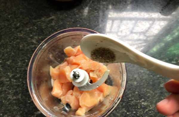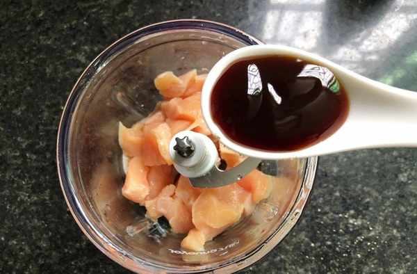 步驟一:這裡用的雞肉是雞胸肉,這種肉清洗幹凈之後直接切開就可以使用瞭,如果是雞腿肉的話,還要先把雞骨頭給去掉才行,切成塊的雞胸肉放到絞肉機中,放蠔油、鹽、胡椒粉、雞蛋清、料酒一起攪拌均勻。