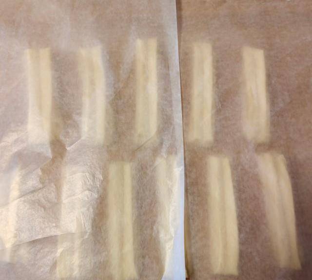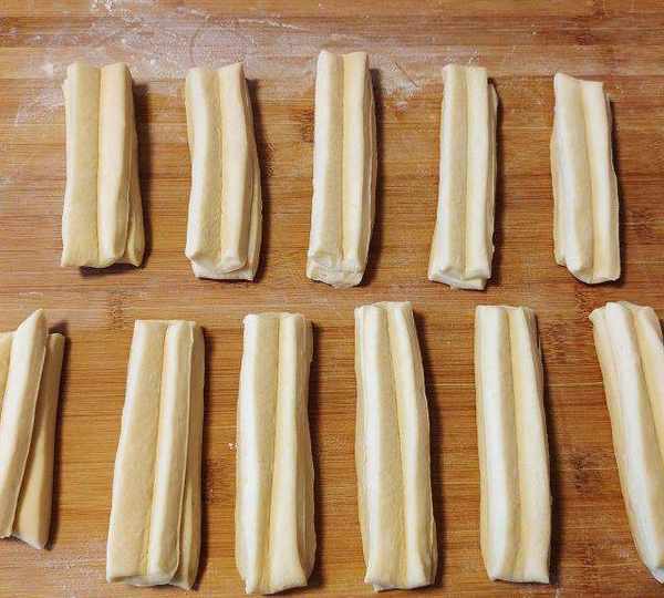 第2步、先將油條面取出至案板上無需再揉面,輕輕搟成長方型面皮,切去多餘的四邊,再切成均勻的條狀,將其中一片中間抹水,重疊另一片再用筷子壓制一下即成油條坯。