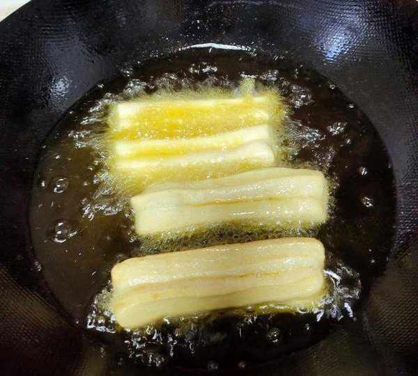 第4步、鍋中放適量的食用油燒至4至5層熱的溫度,下入油條坯炸制。