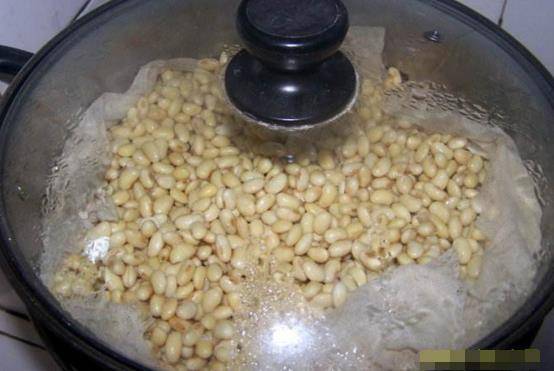 第一個步驟是將四公斤的黃豆放進一個碗裡,然後用適量的水泡三個多鐘頭,然後將已經泡好的黃豆取出,然後濾去多餘的水份,然後取出剩下的空的,或是爛的,然後放進高腳鍋裡,在熬的過程中,將黃豆和小麥皮放進一個沒有水的平底鍋裡,讓其變得金黃。