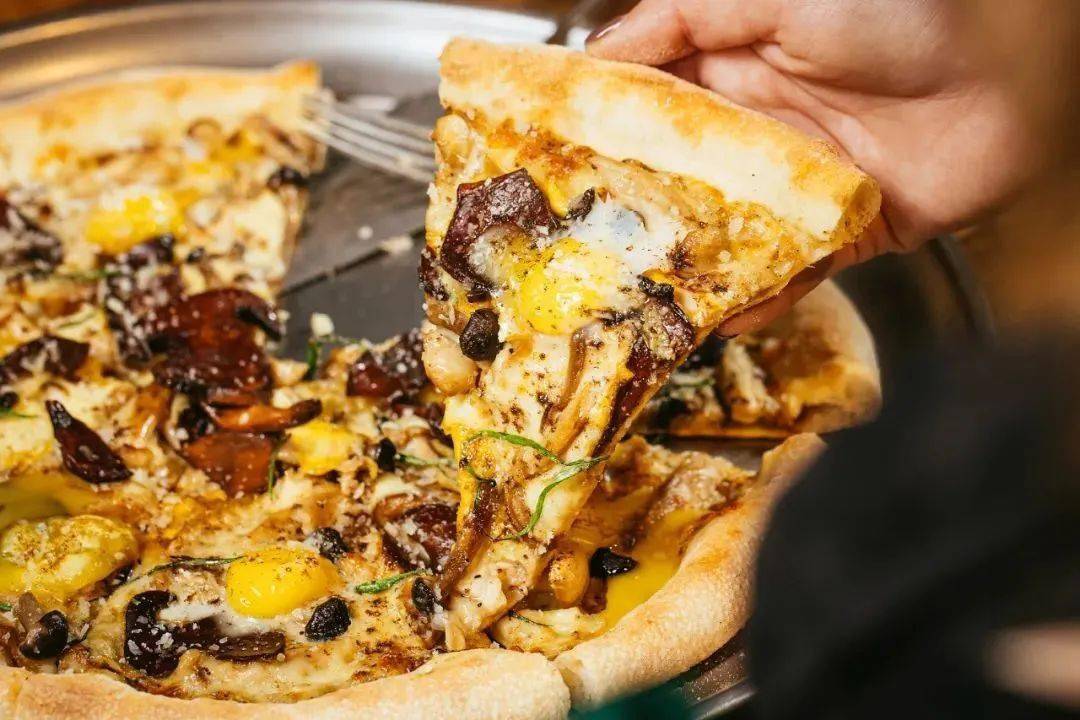 被切分好的披薩,鋪滿整層的食材上再分別放瞭流心的蛋黃,戳破後的濕潤蛋液混合天然麥香和濃鬱菌菇香味,4種以上的口感層次全面入侵瞭你的味蕾,拿到手裡每塊都是精華。