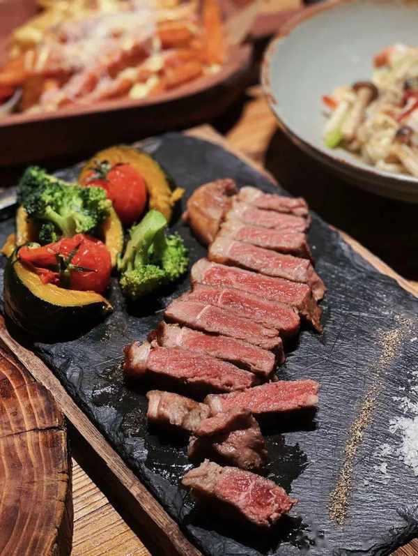 取自和牛帶有肉筋的上腰部,采用果木炭烤的方式,上下雙面 同時加熱,通過高溫使美拉德反應充分發揮,鎖住肉汁,保持牛排肉質鮮嫩的同時,讓果木的 香味有效滲透,端上桌還在冒滋滋聲,讓人垂涎欲滴!
