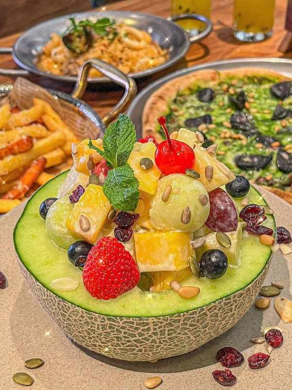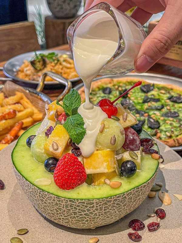 原隻蜜瓜剖開,裡面塞滿瞭草莓、青提、蘋果、芒果、藍莓、火龍果等各種鮮果,碎碎的果仁點綴其上,再淋上酸奶醬,絲滑質感與果香的清爽碰撞,帶來瞭豐富口感。