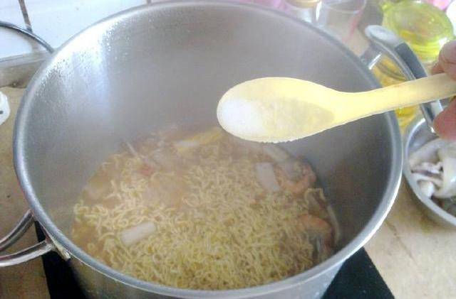 5.當面餅煮軟時,用筷子挑開,加入少許鹽。關火加入味精。