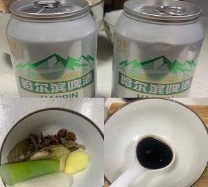 準備兩罐啤酒,薑片八角香葉大蔥放在一個碗裡,一湯勺醬油半湯勺老抽放在一個碗裡。