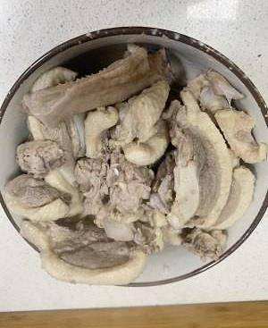 2.我用的是盒馬的麻鴨2盒1000g,冷水下鍋,加薑片料酒,放入麻鴨,待水沸,邊撇去浮沫邊大火煮,大概5分鐘。