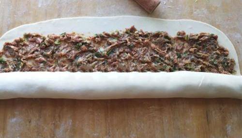 案板上撒上適量的面粉,把醒發好的面團放到案板上,揉搓均勻。用搟面杖搟成薄薄的長方形的大片,將準備好的豬肉餡放上去,用勺子塗抹均勻。從上而下地將面皮卷起來,卷成長條的形狀。