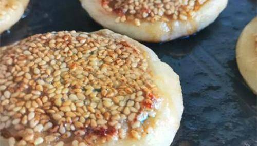 將長條分成若幹個小份,取其中一份,切面朝上。撒上少許面粉,稍稍按扁。準備兩個碗,一個放入芝麻,一個放入雞蛋打散。在小餅的切面上塗上一層蛋液,在沾上芝麻,兩個面都這樣做好。電餅鐺裡倒入適量的油,放入做好的小餅,小火煎。中間翻一次面,兩面都煎成金黃色,就可以出鍋瞭。