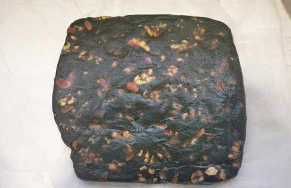 6、借助油紙將紅棗核桃糕整理成型,放涼之後就可以切塊瞭。