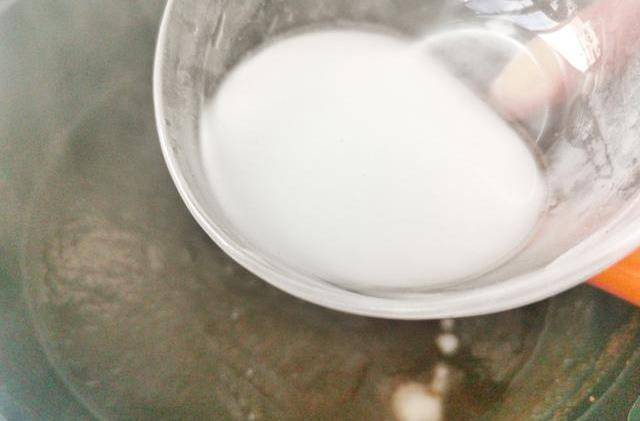 3、10克甘汁園玉米淀粉加入20克清水攪拌成淀粉水,倒入鍋中,再倒入30克玉米油。