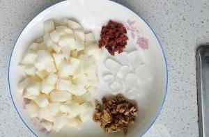 4、利用熬制的半個小時時間將梨子,紅棗切成小塊,紅棗可以放整個的,也可以像我這樣切成小粒。