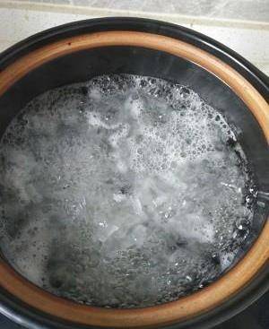 3、將泡發的銀耳,用手摘成小塊,放1500到2000克的水(在熬制過程中,水分蒸發會消失500克左右),將鍋或者煲放入爐子上,燒開後轉中小火熬30分鐘左右。