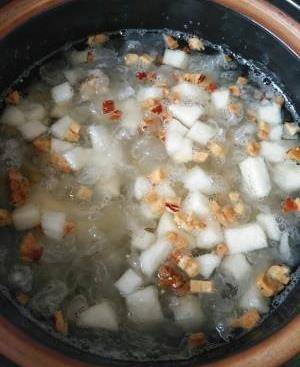 5、煮到看著比較濃稠時,如果不喜歡稠稠的可以在熬銀耳那一個步驟時熬20分鐘左右就可以瞭!放入切好的梨子小塊,紅棗,枸杞,冰糖,開小火在煮10到15分鐘就可以瞭!