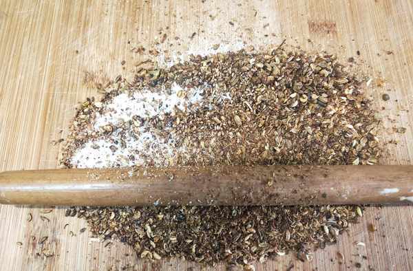 第五步:趁熱用搟面杖將花椒,小茴香和芝麻一塊搟得稀碎,大量制作的也可以用料理機打碎,攪拌均勻密封保存防止香味流失,食鹽同樣的也可以用熱鍋翻炒一下,這樣可以防止椒鹽受潮,保存得當的可以忽略這一步。
