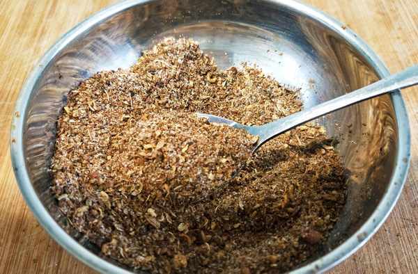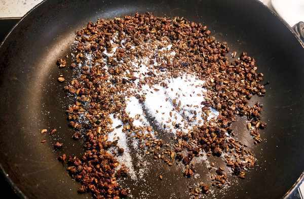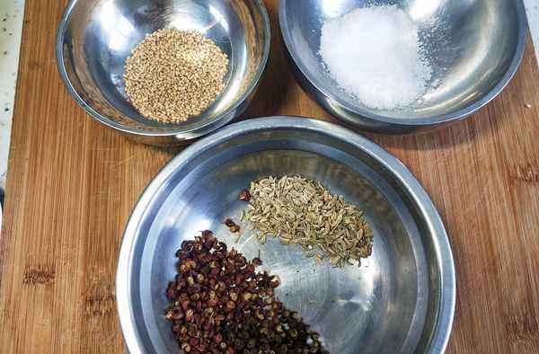 【食材準備】:幹紅花椒15克,青花椒10克,小茴香5克,白芝麻5克,食鹽10克