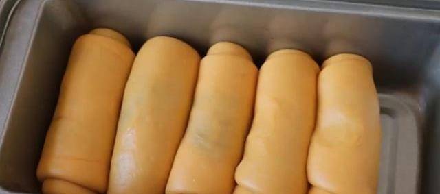 搟好之後,選擇一頭開始卷起來。做好後放入吐司模具裡面,如果傢中沒有模具的話,可以用鐵盆,但是上面要刷油,防止粘連。