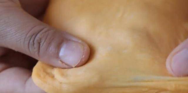 面團揉成形之後,加入12克的玉米油。用手揉搓把油和面粉充分的融合,像洗衣服一樣向前搓,放在案板上繼續揉,大概需要20分鐘左右的時間。揉到這個狀態,能夠拉出膜就可以瞭。
