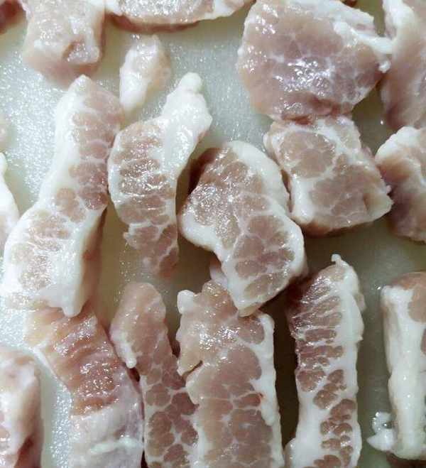 第二步:準備肥瘦的五花肉,脂肪和瘦肉的比例可以根據自己的口味選擇。然後將五花肉切成小塊。