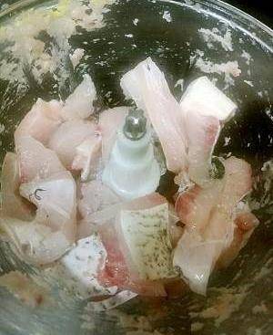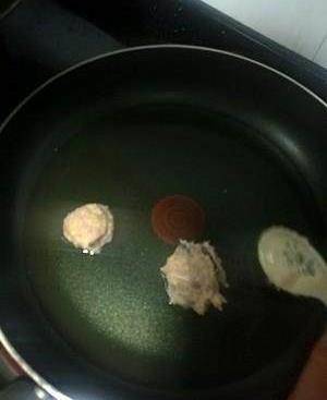 用手抓一把肉糜,從虎口擠出圓形,用湯匙刮下放進平底鍋裡煎。中間要不停的翻動魚丸,讓它受熱均勻(有魚皮沒絞碎的話,也扔鍋裡一起煎)