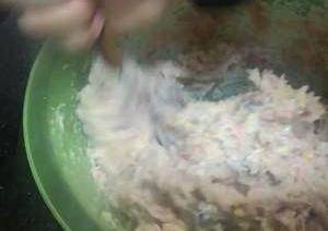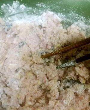 所有材料都翻拌均勻就可以開始沿著順時針方向攪拌瞭。讓肉餡攪拌上勁至攪拌困難就可以瞭