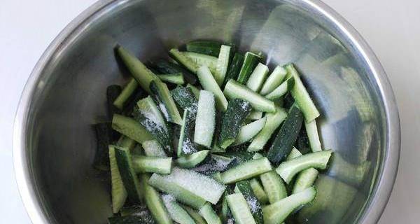 第一步,我們先把買回來的黃瓜放到水龍頭下面沖洗幹凈,把表面的刺用手搓掉,然後把黃瓜表面的水弄幹凈,拿紙搽幹凈,不能有一點水。然後把黃瓜放到菜板上面,用菜刀把黃瓜都切成差不多4厘米的細條,再拿出一個不銹鋼盆子,把黃瓜條放進去,加入足夠的鹽,用兩隻手抓拌黃瓜條,讓鹽粒跟黃瓜充分接觸,抓到鹽開始融化就差不多瞭,醃制3個小時。等3個小時的時間到瞭,就會看到盆子裡出瞭很多水,把水倒掉。