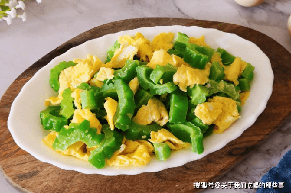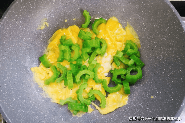 2、雞蛋打入碗中,加入適量食鹽攪拌均勻。鍋裡倒入適量油,八成熱時倒入雞蛋液,大火煎一會兒,熟透後炒成大塊,倒入苦瓜片翻炒均勻,加入適量鹽調味,炒勻即可出鍋。