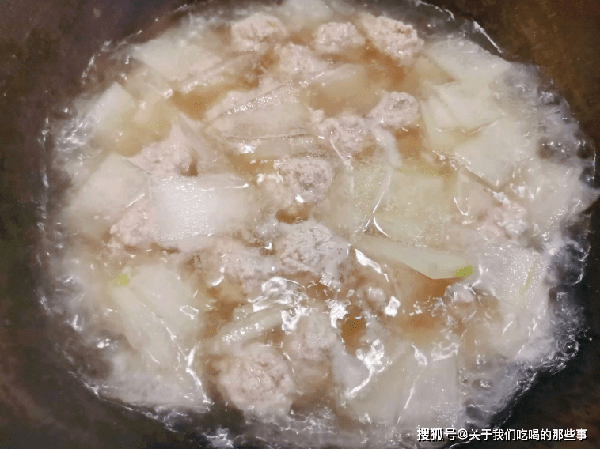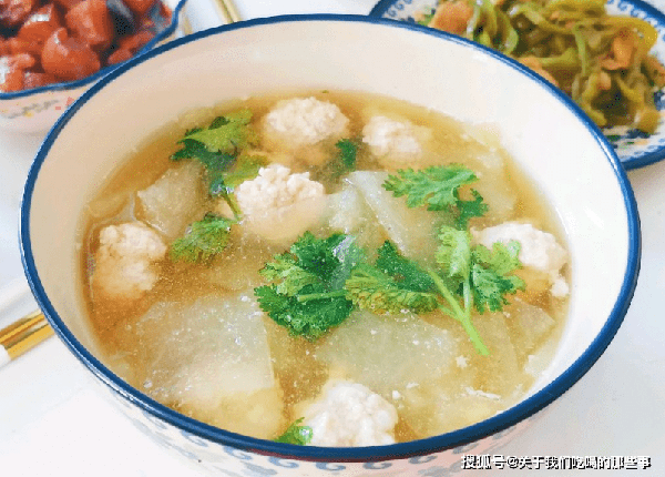2、冬瓜去皮洗幹凈,切成小塊,香菜洗幹凈後切末。鍋裡加入清水,大火燒開,用手把肉餡搓成丸子,放入鍋中煮一會兒,撇掉浮沫,煮至丸子全部浮起。