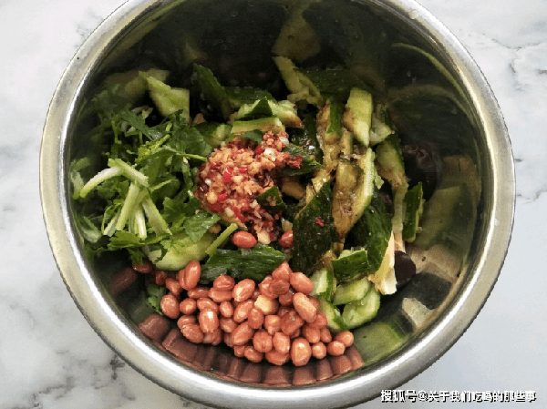 3、碗裡加入蒜末、蔥花、小米椒、辣椒面、白芝麻,倒入一些熱油炸出香味,加入食鹽、生抽、香醋、白糖、雞精攪拌均勻。把花生米、腐竹、木耳、黃瓜放在大碗中,加入香菜段,倒入調料汁,翻拌均勻即可。