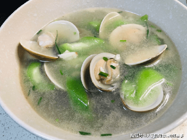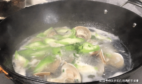 2、鍋裡倒入適量油,燒熱後放入蒜末爆香,倒入絲瓜塊,大火翻炒一會兒,斷生後加入適量開水,放入焯過水的蛤蜊,大火煮至湯色變白,加入適量食鹽、胡椒粉,繼續煮2分鐘,撒上蔥花即可出鍋。