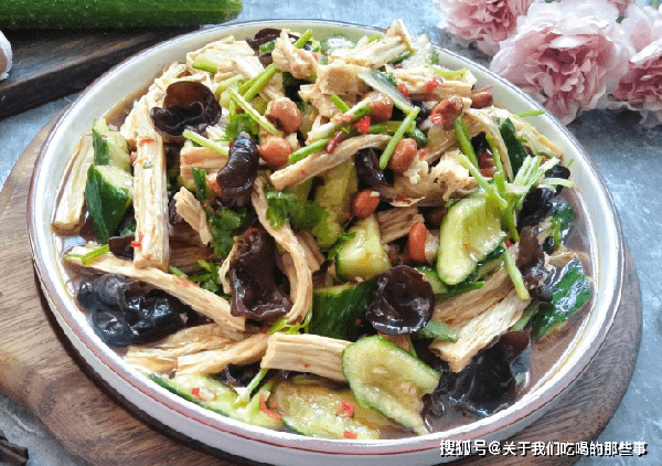 2、黃瓜洗幹凈,用刀拍扁,切成小塊。鍋裡加水燒開,放入腐竹、木耳煮2分鐘,撈出過涼水,瀝幹水分備用。