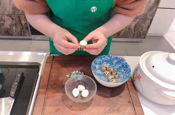 將鵪鶉蛋煮熟,去殼,放在一旁備用。