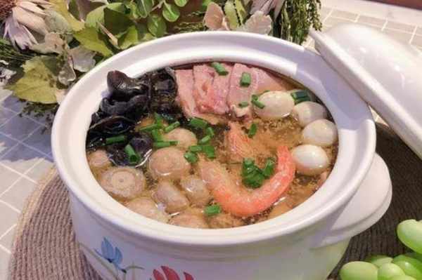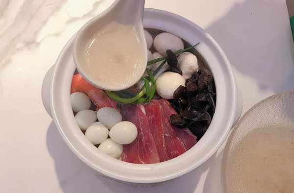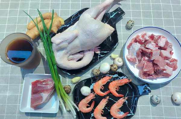 食材:雞、排骨、火腿、鵪鶉蛋、木耳、蘑菇、蝦、蔥、薑、蒜