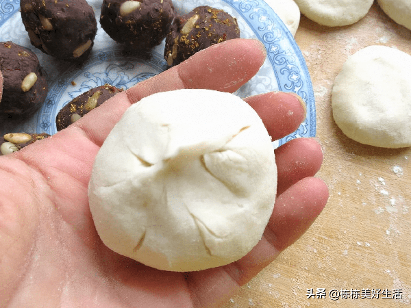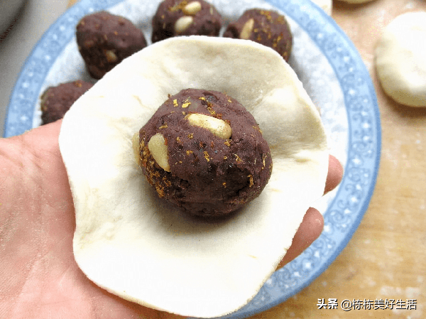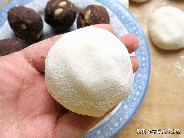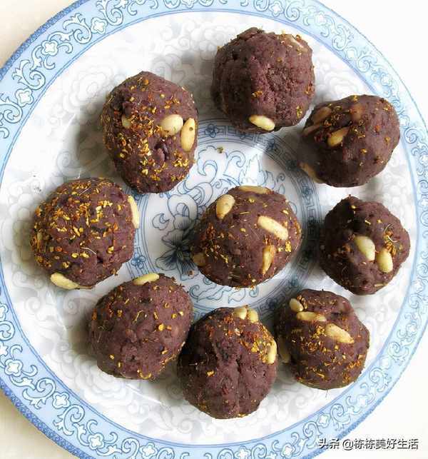 3,自製豆沙餡加入桂花和松子團成球狀。