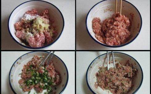 制作:1.將鹽,薑末等調味料放入肉餡中;2.順著一個方向攪拌上勁;3.加入小蔥末和香油;4.順著相同的方向繼續攪拌均勻;