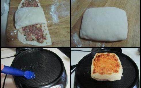 13.中間部分同樣的方法折疊好後再向右邊折疊;14.同樣方法折疊後,這樣整個餅子就做好瞭,將邊緣處按緊;15.在電餅鐺上抹上油;16.將餅子放入,煎成兩面金黃即可。