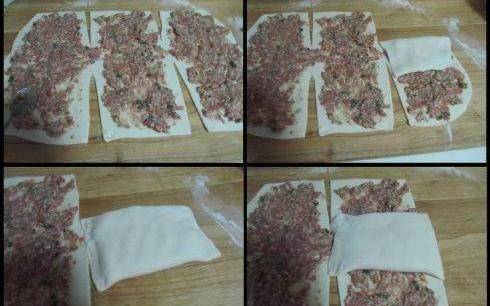 9.將肉末平鋪在面皮上,邊緣不要鋪滿;10.從左上邊的三分之一向中間折疊,並按緊邊緣;11.將左下邊的三分之一出也向中間折疊,並按緊邊緣;12.將左邊疊好的餅子從左到中間的部分折疊;
