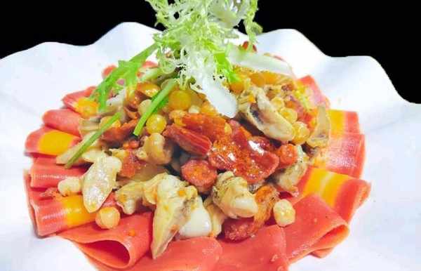 把海螺肉和以上的調料拌勻,擺放在紅蘿卜上,再用苦苣點綴即可
