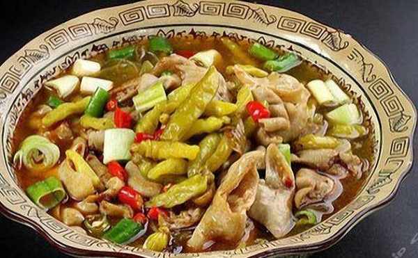 將鍋洗凈,加入化雞油,大火燒至五成熱,下泡酸菜片,泡野山椒段,泡薑片,大蒜片,耙豌豆炒出香味,放入肥腸及湯燒沸後,加入豬血一同燒20分鐘。