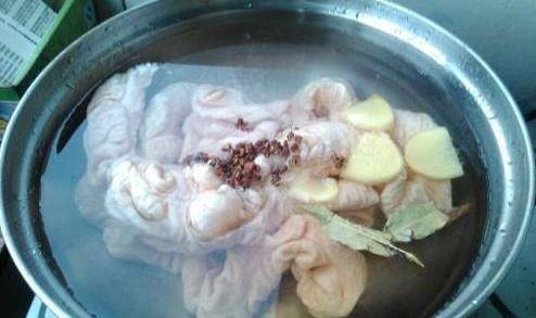 在幹凈炒鍋中加入1000毫升清水,將肥腸放入鍋中,加入適量白酒,薑片,蔥段,花椒以大火燒沸,轉小火燒40分鐘至熟糯,撈出備用。