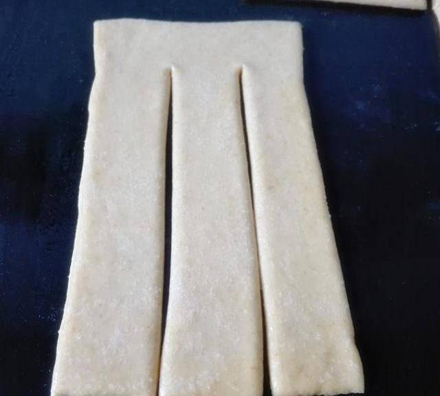 第4步、取一面皮,順長邊切二刀將面皮均分為三份,上端不要切斷。