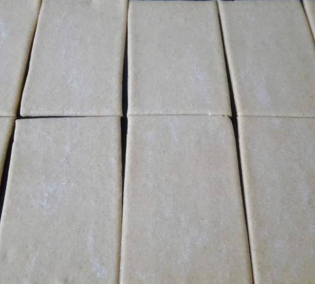 第3步、將面團搟成長方形面皮,刷一層食用油,撒上揶子粉,切成相應的等份(大小、長短根據個人喜愛)。