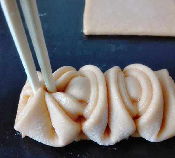 第6步、用三根筷子分別放在面卷上,往下壓。